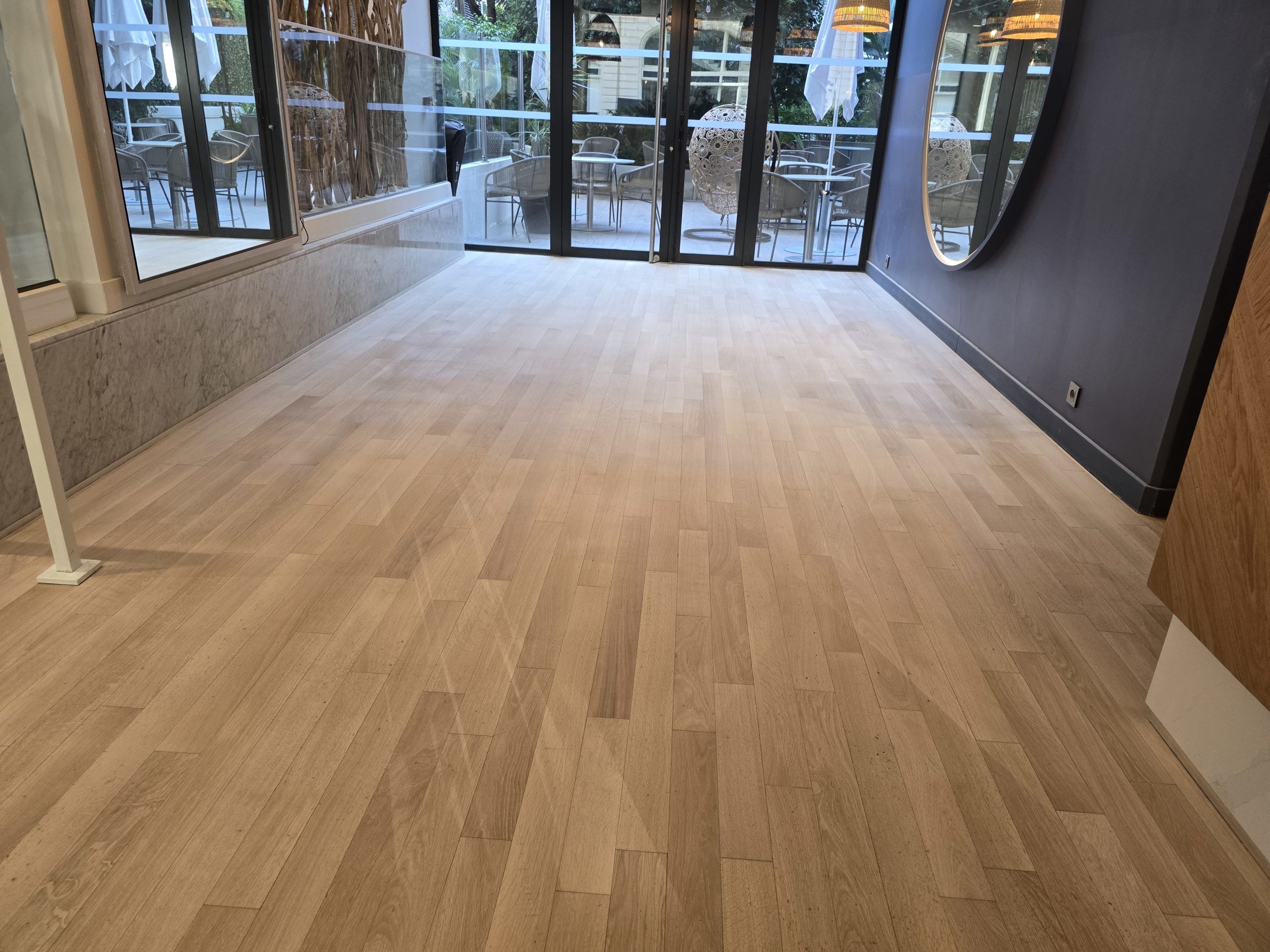 Notre fidèle client, le magnifique hôtel CANNES BEACH HOTEL , hôtel 4 étoiles, situé 13 rue du Canada à Cannes à côte de l’hôtel CARLTON nous a comme depuis 5 ans missionné pour une prestation minutieuse. Après avoir l’entretien des marbres depuis plusieurs années NICE SOLS SYSTEM « s’attaque » au parquet de l’hôtel. Nous avons débuté par une première partie du bar (profitant de la fermeture annuelle de l’hôtel). Le parquet est de qualité mais sa rénovation devenait plus qu’urgente. Ce ponçage à permis un net éclaircissement du bois ce qui est en parfaite harmonie avec la décoration dite « bohème » de l’hôtel. Nous avons utilisé un vernis NATUREL dit invisible de chez Giorda pour obtenir cet effet.